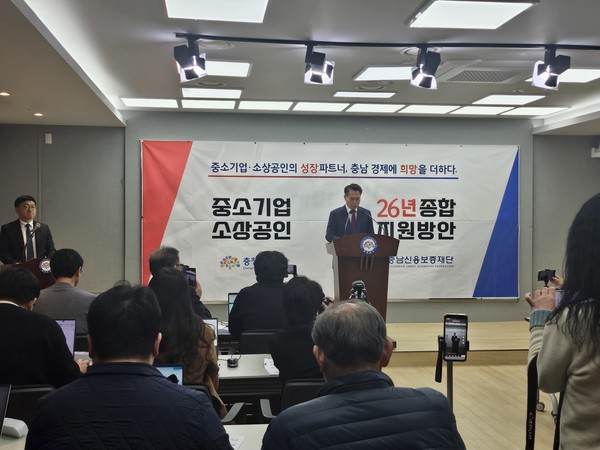 [중부와이드뉴스/조계원기자] 충남신용보증재단(이사장 조소행, 이하 충남신보)은 27일 오전 11시, 도청 프레스센터에서 언론브리핑을 열고 「2026년 중소기업·소상공인 종합지원 방안」을 발표했다.충남신용보증재단이 코로나19 이후 최대 규모인 1조 2,026억 원의 신규 보증을 공급하며, 도내 중소기업과 소상공인 경제 활성화에 본격 나섰다.