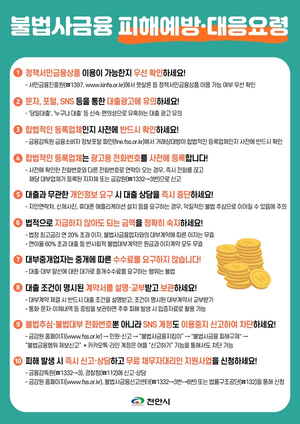 [중부와이드뉴스/조정호 기자] 천안시가 민생 경제를 위협하는 불법사금융으로부터 시민을 보호하기 위해 제도적 대응과 홍보에 나섰다.