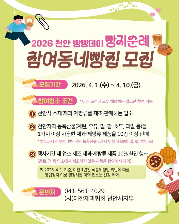 [중부와이드뉴스/조정호 기자] 천안시가 오는 6월 열리는 ‘2026 빵지순례 빵빵데이’에 참여할 역량 있는 동네 빵집을 공개 모집한다고 1일 밝혔다.
