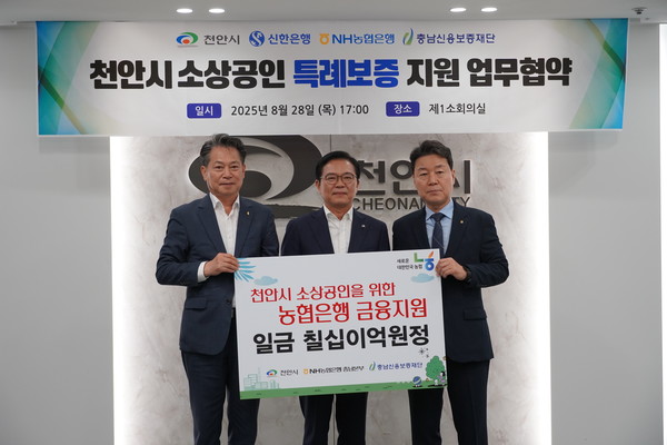 [중부와이드뉴스/조계원 기자] 충남신용보증재단(이하 “충남신보”)은 28일 천안시청에서 천안시, 신한은행, 농협은행과 함께 총 120억 원 규모의 소상공인 특례보증을 위한 업무협약을 체결했다고 밝혔다.